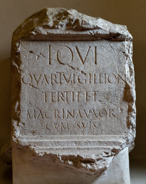 - Iovi / Quart(us) Vigillion(is) / Terti f(ilius) et / Macrina uxor / cum suis / v(otum) s(olverunt)
