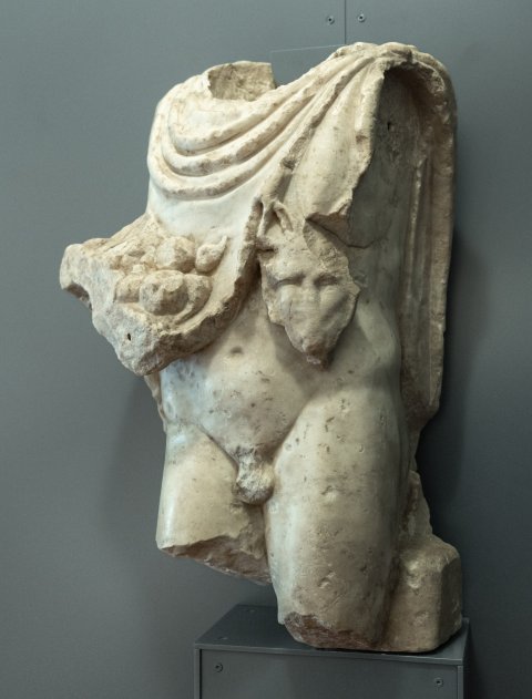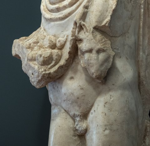- mythische Figur: stehender Silvanus, nackt bis auf Mantel um die Schultern, im Mantelbausch Früchte; der von der linken Schulter hängende Mantel endet in einer gehörnten Maske.