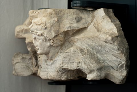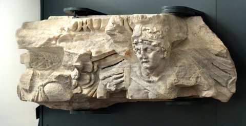 - Fragment eines Figurenkapitells von der Scaenae frons des Theaters: links Schulterparie einer geflügelten Figur, rechts Kopf und Brustpartie eines jungen Krierger mit Helm, Panzer und Schwertgurt.