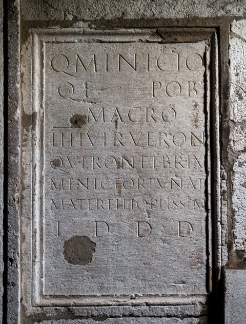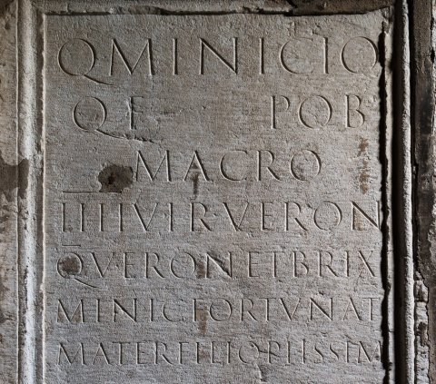 - Q(uinto) Minicio / Q(uinti) f(ilio) Pob(lilia) / Macro / IIIIvir(o) Veron(ae) / q(uaestori) Veron(ae) et Brix(iae) / Minic(ia) Fortunat(a) / mater filio piissim(o) / l(ocus) d(atus) d(ecreto) d(ecurionum)