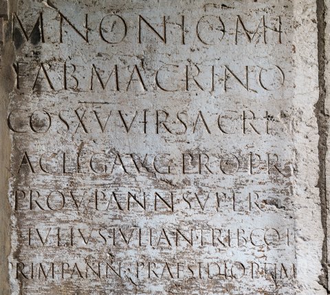 - M(arco) Nonio M(arci) f(ilio) / Fab(ia) Macrino / co(n)s(uli) XVvir(o) sacr(is) / fac(iundis) leg(ato) Aug(usti) pro pr(aetore) / prov(inciae) Pann(oniae) super(ioris) / T(itus) Iulius Iulian(us) trib(unus) coh(ortis) / Prim(ae) Pann(oniorum) praesidi optim(o)