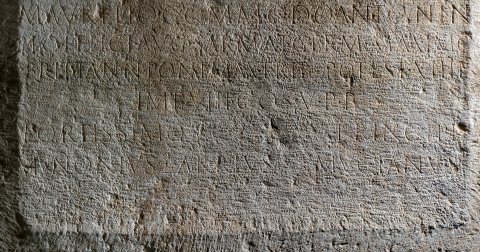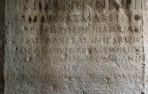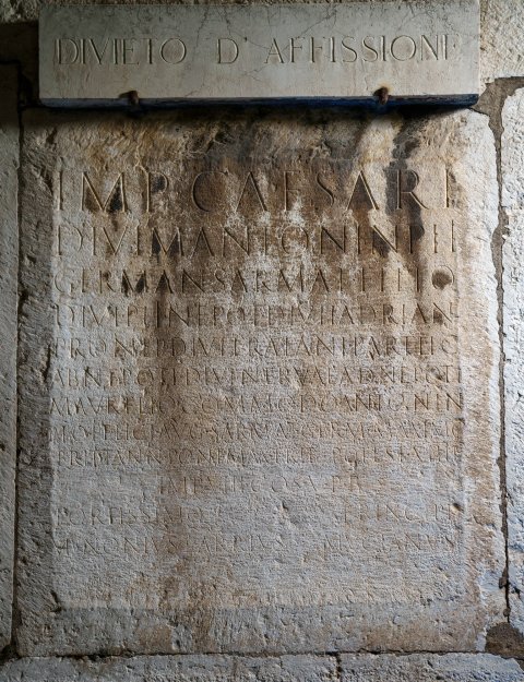 - Imp(eratori) Caesari / divi M(arci) Antonini Pii / German(ici) Sarmat(ici) f(ilio) / divi Pii nepot(i) divi Hadriani / pronep(oti) divi Traiani Parthic(i) / abnepoti divi Nervae adnepoti / M(arco) Aurelio Commodo Antonin(o) / Pio Felici Aug(usto) Sarmat(ico) Germ(anico) maximo / Brit{t}ann(ico) pontif(ici) max(imo) trib(unicia) potest(ate) XIIII / imp(eratori) VIII co(n)s(uli) V p(atri) p(atriae) / fortissimo principi / M(arcus) Nonius Arrius Mucianus