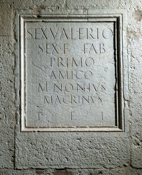 - Sex(to) Valerio / Sex(ti) f(ilio) Fab(ia) / Primo / amico / M(arcus) Nonius / Macrinus / t(estamento) f(ieri) i(ussit)