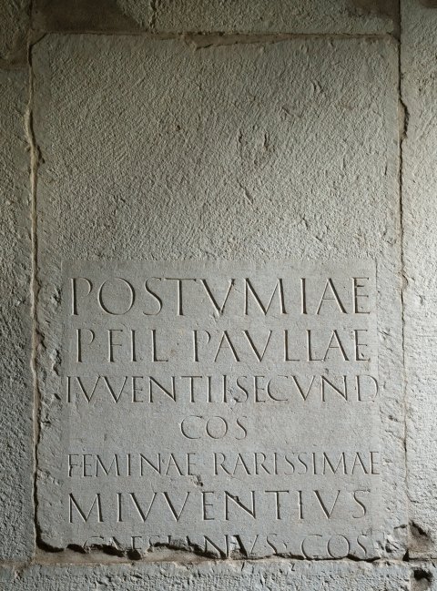 - Postumiae / P(ubli) fil(iae) Paullae / Iuventii Secund(i) / co(n)s(ulis) / feminae rarissimae / M(arcus) Iuventius / Caesianus co(n)s(ul)