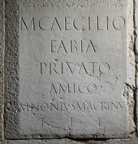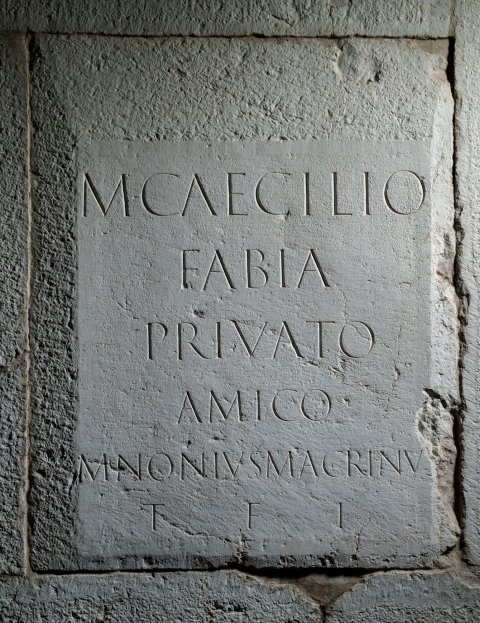 - M(arco) Caecilio / Fabia / Privato / amico / M(arcus) Nonius Macrinus / t(estamento) f(ieri) i(ussit)