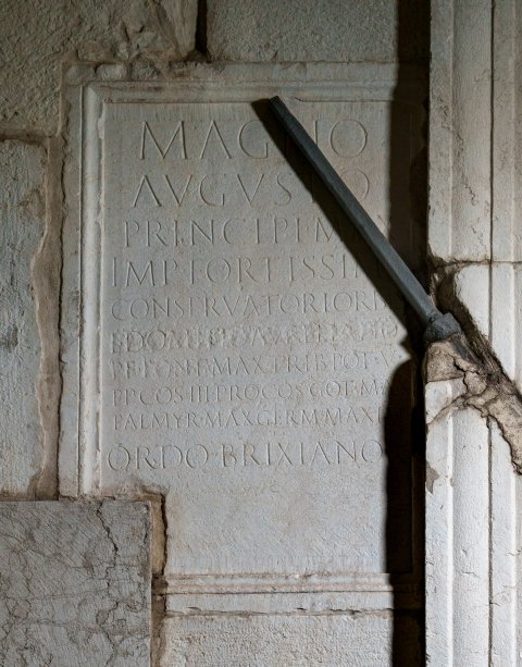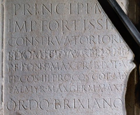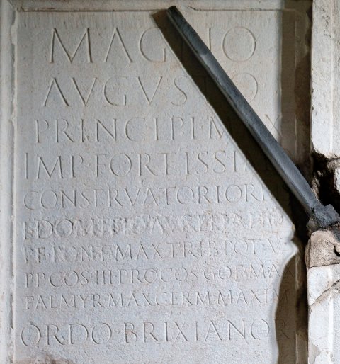 - Magno / Augusto / principi ma[x(imo)] / Imp(eratori) fortissim[o] / conservatori orbis / L(ucio) [[Domitio Aureliano]] / P(io) F(elici) pont(ifici) max(imo) trib(unicia) pot(estate) V / p(atri) p(atriae) co(n)s(uli) III proco(n)s(uli) Goth(ico) max(imo) / Palmyr(eno) max(imo) Germ(anico) maxim(o) / ordo Brixianorum
