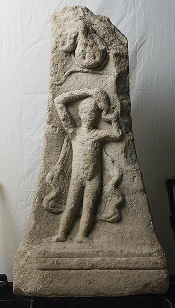 Auf der Vorderseite mythische Figur (Attis ?), Musikinstrument: tanzende nackte Figur mit langem Mantel über Schultern und Rücken, in den erhobenen Händen Schallbecken (Kymbala). Darüber Gorgoneion.