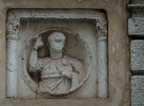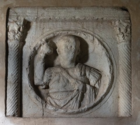 - Architrav auf zwei Säulen mit Spiralkanneluren, dazwischen Medaillon mit Halbfigur eines Mannes (Soldat - Offizier) in Panzer und Mantel, rechte Hand mit Attribut (Tuch ?) erhoben.