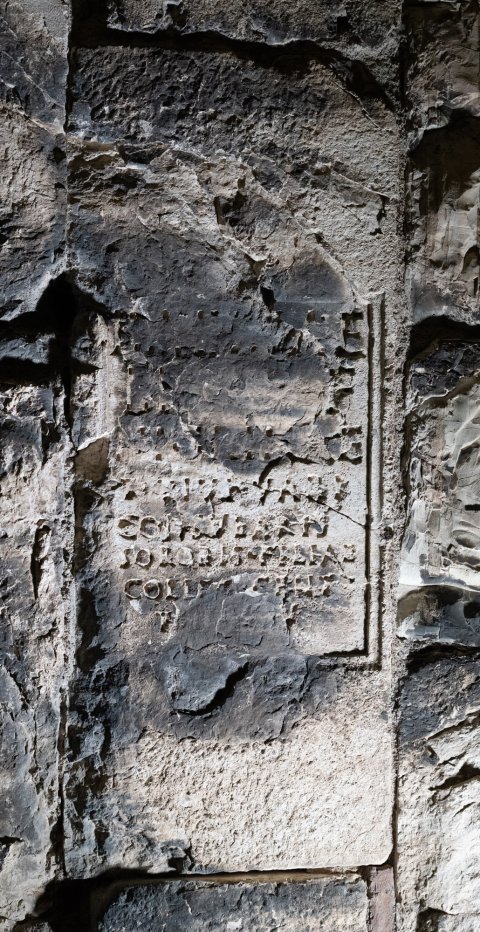 - nur Vorderseite sichtbar, stark abgewittert, vertiefte Buchstaben für Metalleinlagen