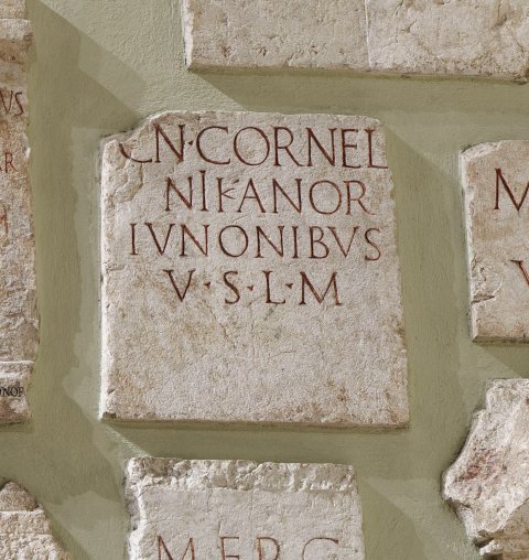- Cn(aeus) Cornel(ius) / Nikanor / Iunonibus / v(otum) s(olvit) l(ibens) m(erito)