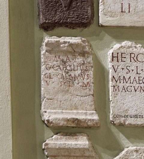- Mat(ronis) / C(aius) Caecilius / C(ai) l(ibertus) Calamus / v(otum) s(olvit) l(ibens) m(erito)