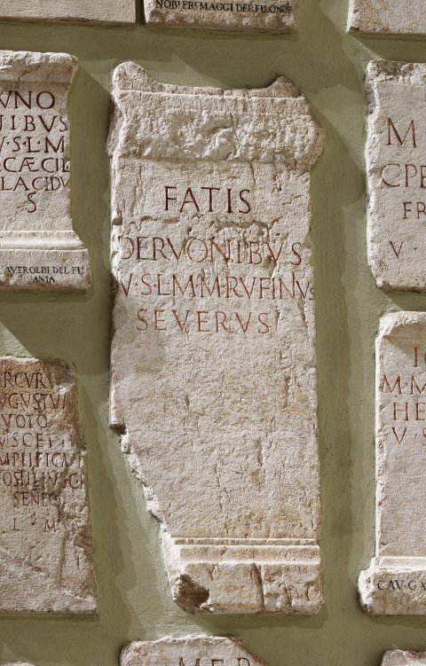 - Fatis / Dervonibus / v(otum) s(olvit) l(ibens) m(erito) M(arcus) Rufinius / Severus