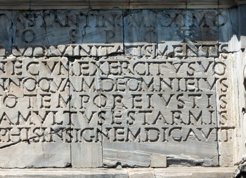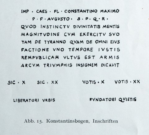 - Imp(eratori) Caes(ari) Fl(avio) Constantino Maximo / P(io) F(elici) Augusto s(enatus) p(opulus)q(ue) R(omanus) / quod instinctu divinitatis mentis / magnitudine cum exercitu suo / tam de tyranno quam de omni eius / factione uno tempore iustis / rem publicam ultus est armis / arcum triumphis insignem dicavit