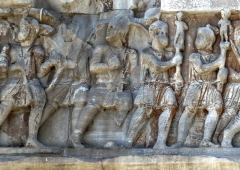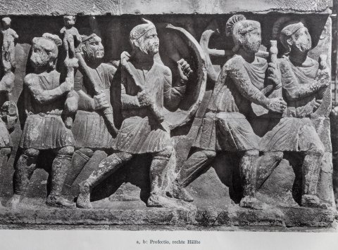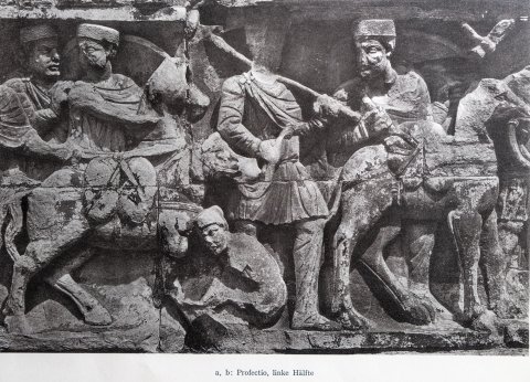 - Auszug des Heeres (profectio). Ganz links, noch auf der Nordseite (siehe Bilder Nr. 3, 12), Eckrelief mit einem Reiter und einem Fußsoldaten, die auf ein Tor zugehen, das das ausziehende Heer bereits passiert hat. Links Wagen mit Offizieren, dann Train mit Lasttieren (darunter ein Dromedar) und unbewaffneten Soldaten; dann Kampftruppen mit cornicines und Trägern von Stangen mit Götterbildern.