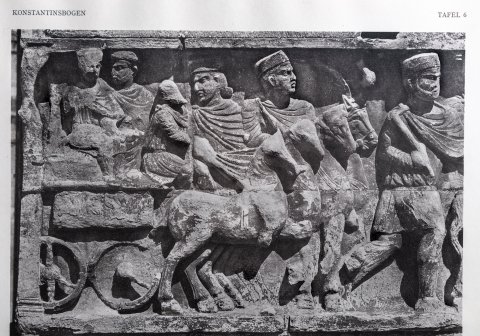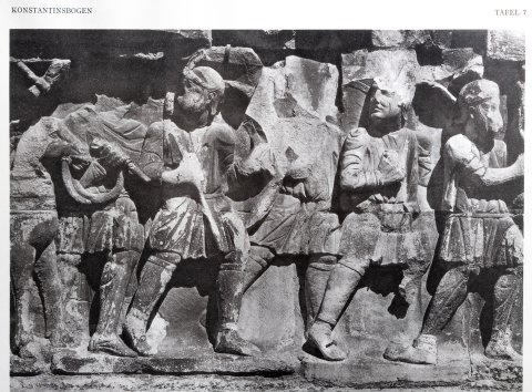 - H. P. L’Orange - A. von Gerkan: Der spätantike Bildschmuck des Konstantinsbogens 1939, 52 ff.; G. Koeppel: Die historischen Reliefs der römischen Kaiserzeit IV. In: Bonner Jahrbücher 186, 1986, 1–90; M. L. Conforto u. a., Adriano e Costantino. Le due fasi dell'arco nella Valle del Colosseo. Mailand 2001; M. Sandberg, in: Potestas 8, 2015, 111