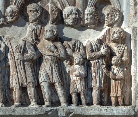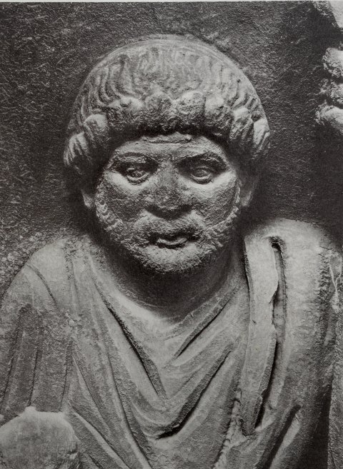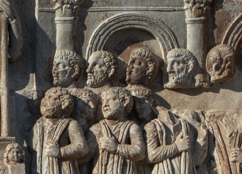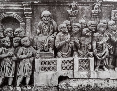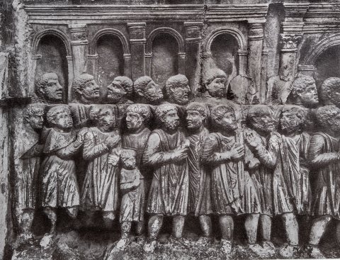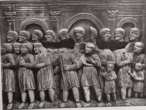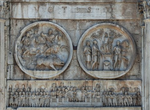 - Ansprache des Kaisers Konstantin (Oratio Augusti): der Kaiser steht umgeben von Togati (Senatoren) auf der Rednertribüne (rostra) auf dem Forum Romanum; an den Ecken der Tribüne je eine Sitzstatue eines bärtigen Kaisers(Hadrian, Marc Aurel), im Hintergrund fünf Säulen mit Statuen (in der Mitte thronender Jupiter, seitlich die Tetrarchen). Zu beiden Seiten der Tribüne Zuhörer in zwei Reihen (Männer in kurzen Tuniken, einige Knaben). Im Hintergrund Gebäude mit Bogenöffnungen.