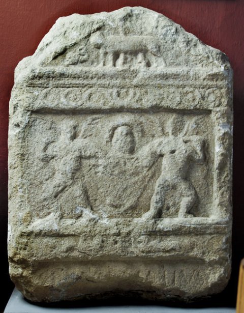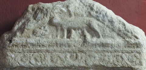 Im Giebelfeld Mythos (Lupa Capitolina). Darunter Zwischenfries mit Spiralranken.