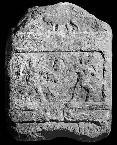 Im Hauptbild Genius: zwischen Säulen zwei nackte geflügelte Knaben, die eine Girlande halten, über dieser ein Gorgoneion. Zwischenfries mit Tieren: jagende Raubkatzen. - Inschrift