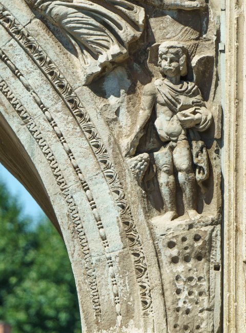Schwebende Victorien mit Tropaia, unterhalb ihrer Füße je eine stehende jugendliche Jahreszeitenpersonifikation (Sommer und Herbst). Auf dem Schlussstein des Bogens stehende Gewandfigur (Quies oder Securitas rei publicae).