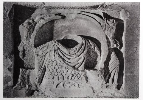 - Clipeusbüste eines Mannes (Kaiser) im Panzer mit Feldherrenbinde und edelsteinbesetztem Gürtel, Mantel mit Prunkfibel mit Anhängern. Der Clipeus wird von zwei Victorien gehalten.