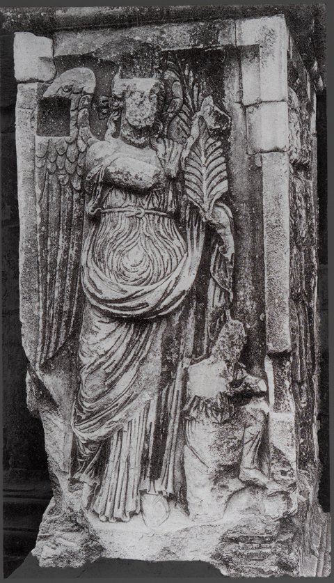 Auf der rechten Nebenseite zwei Gefangener (in Ärmeltunica, Mantel und Hosen) und zwei römische Soldaten mit Helm, Panzer, Hosen, der vordere mit großem Ovalschild.