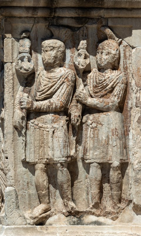 Auf der rechten Nebenseite zwei Signiferi (signa mit Büsten) mit Helm, Panzer, Sagum und Schuhen.