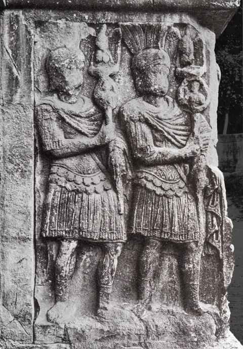 Auf der linken Nebenseite zwei signiferi (signa mit Büsten, darüber Adler), beide mit Helm, Panzer, Sagum und Schuhen.