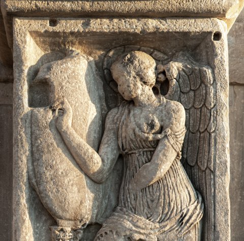 Auf der linken Nebenseite zwei römische Soldaten, links Aquilifer, rechts Signifer, in Helm, Sagum, Panzer und Schuhen.