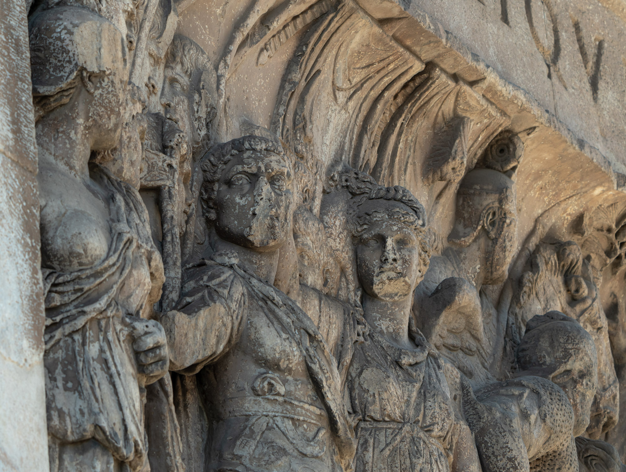 34032 Relief im Hauptdurchgang des Konstantinbogens: Adlocutio Trajans und Kampfszene