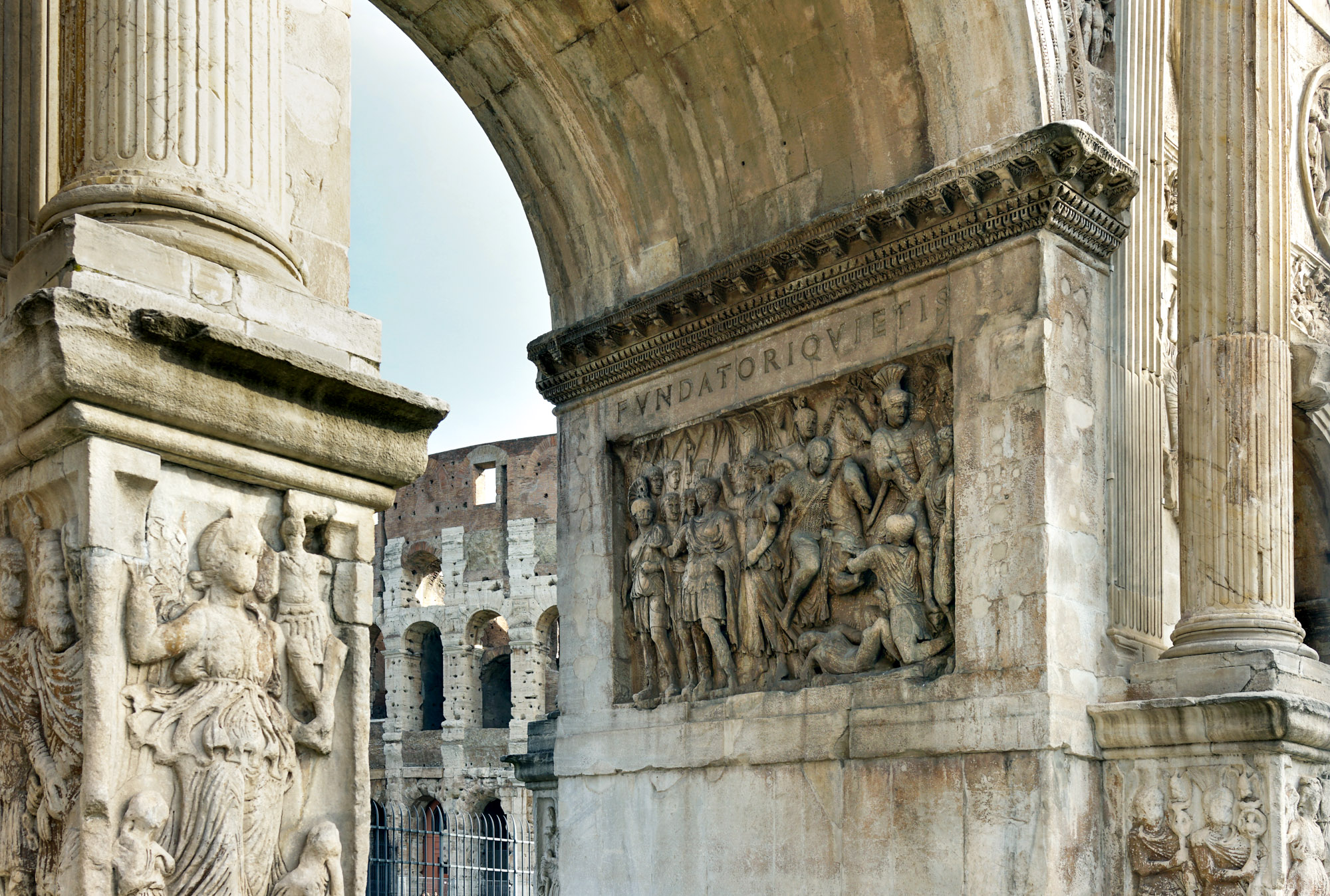 34032 Relief im Hauptdurchgang des Konstantinbogens: Adlocutio Trajans und Kampfszene