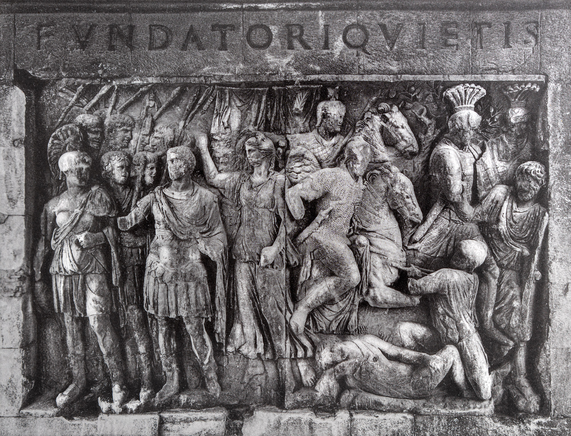 34032 Relief im Hauptdurchgang des Konstantinbogens: Adlocutio Trajans und Kampfszene
