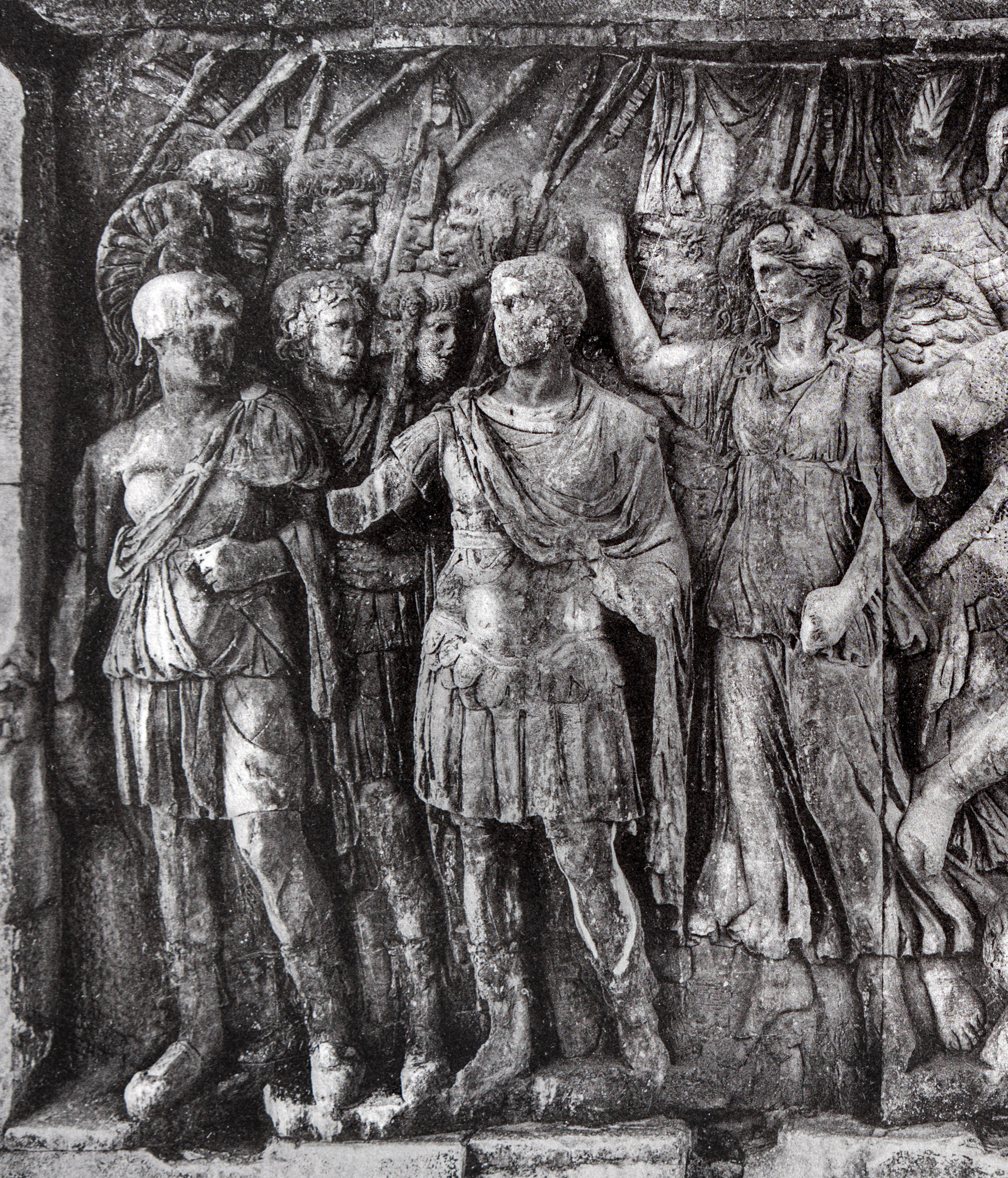 34032 Relief im Hauptdurchgang des Konstantinbogens: Adlocutio Trajans und Kampfszene