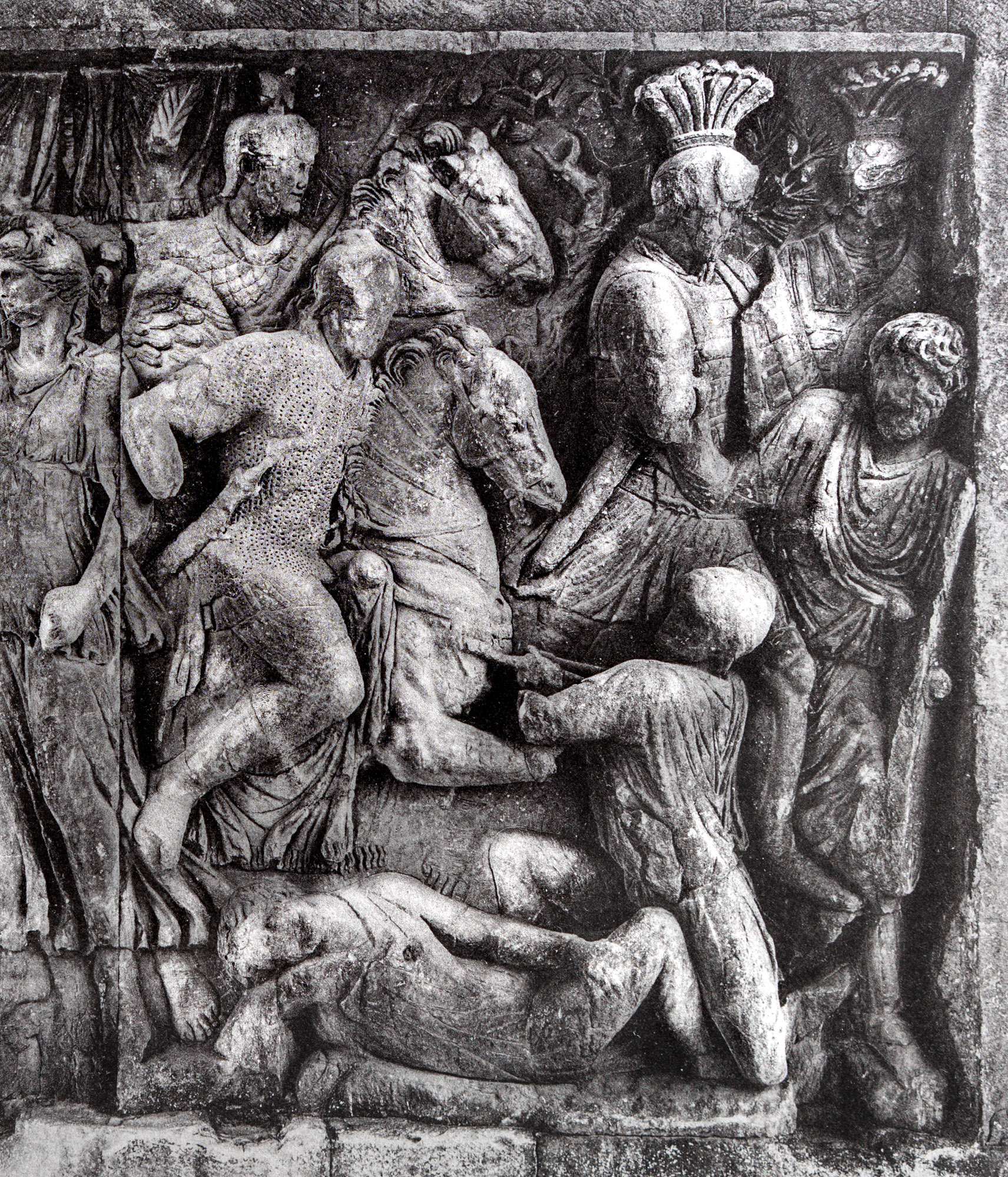 34032 Relief im Hauptdurchgang des Konstantinbogens: Adlocutio Trajans und Kampfszene