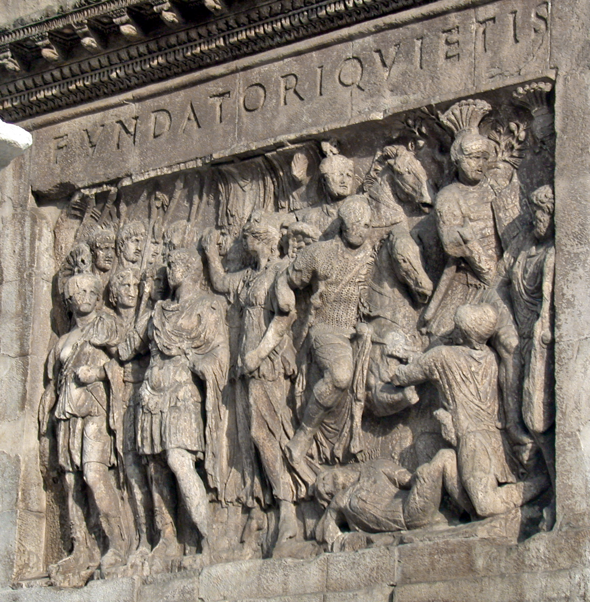 34032 Relief im Hauptdurchgang des Konstantinbogens: Adlocutio Trajans und Kampfszene