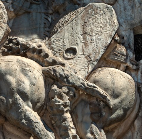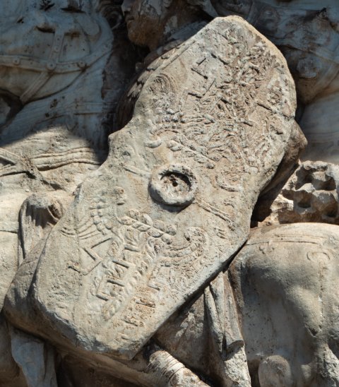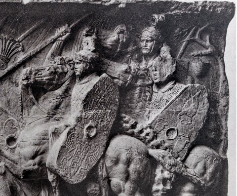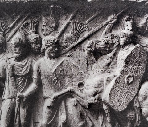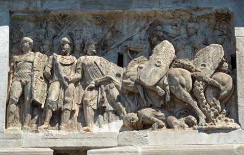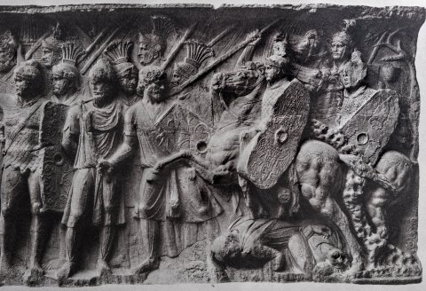 - Teil eines Reliefzyklus von einem Siegesmonument des Trajan. Rechts römische Reiterei, die über Gefallene hinweg reitet; der vordere Reiter bedroht mit dem Speer einen Daker, der sein Schwert gezogen hat. Neben ihm Gefangener mit auf den Rücken gefesselten Händen, links und im Hintergrund römische Fußsoldaten.