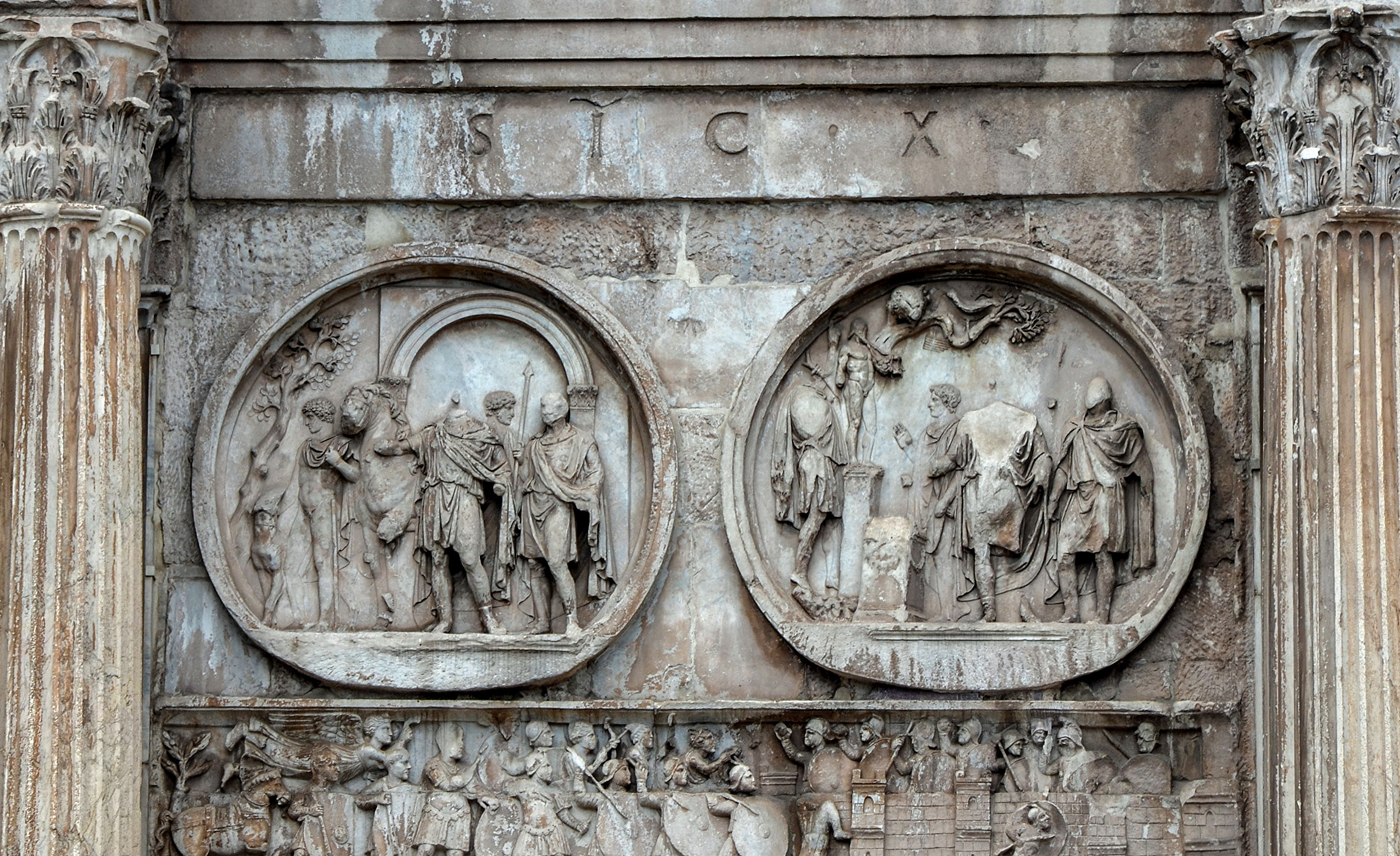 34043 Hadrianischer Tondo auf der Südseite des Konstantinsbogens: Aufbruch zur Jagd