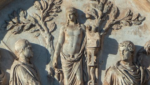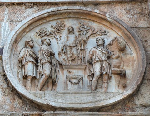 - Relieftondo von einem Monument des Kaisers Hadrian: zwischen zwei Lorbeerbäumen Statue des Apollo, zu seiner Linken Dreifuß mit Schlange, darauf Kithara, zu seiner Rechten Greif; vor der Statuenbasis Altar mit Girlande, links opfernder Kaiser (Liciniusporträt mit Nimbus) mit geschultertem Speer, hinter ihm bärtiger Mann; rechts Mann, der ein Pferd am Zügel hält.