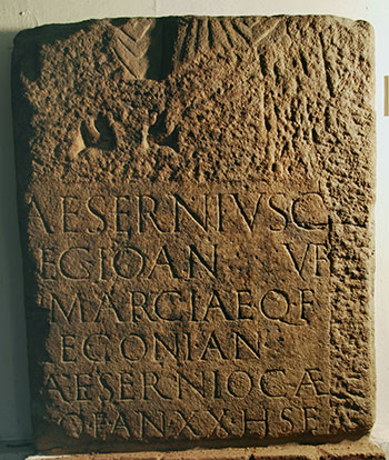 - [C(aius) C]aesernius C(ai) / [f(ilius) Sen]ecio an(norum) v(ivus) f(ecit) / [sibi et] Marciae Q(uinti) f(iliae) / [---a]e coni(ugi) an(norum) / [et C(aio) C]aesernio Cae/[---]o f(ilio) an(norum) XX h(ic) s(itus) e(st)