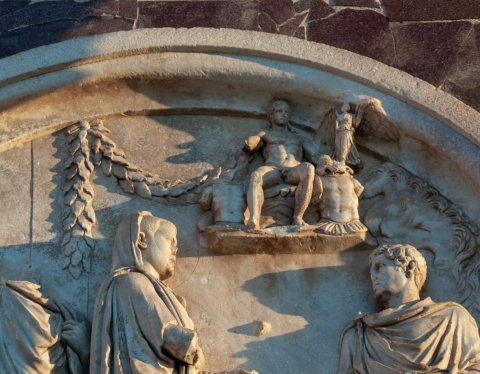 - Reliefteile abgeschlagen, Kopf des Hadrian durch den des Licinius ersetzt