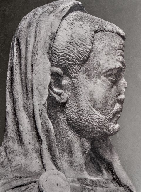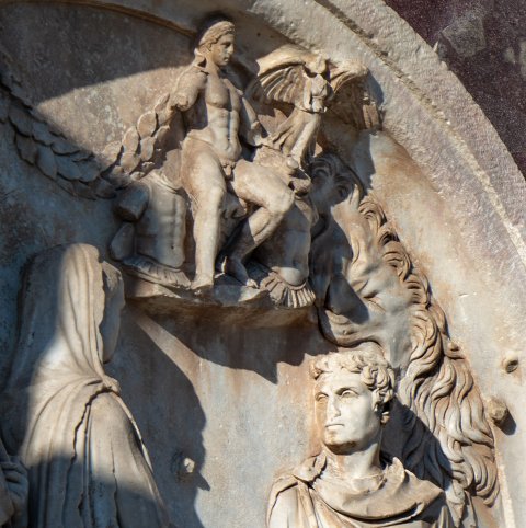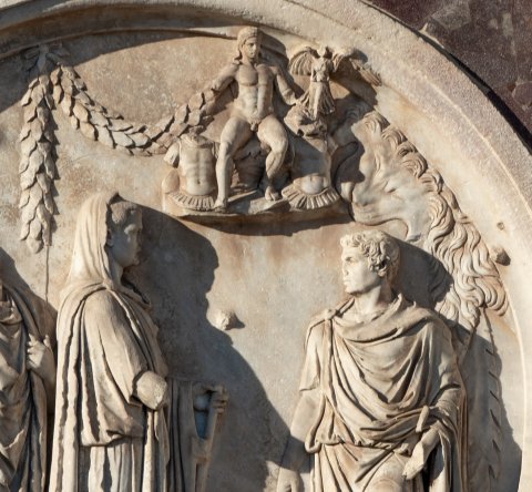 - Relieftondo von einem Monument des Kaisers Hadrian: an einem Altar mit Girlandenschmuck opfernder Kaiser (Liciniusporträt mit Nimbus), hinter ihm ein Mann und ein Jüngling (Antinous ?) mit Speer; auf der anderen Seite des Altars stehender Mann. Über dem Altar auf Standleiste kleine Figur des sitzenden Hercules , zu seiner Rechten Girlande, zu seine Linken Victoria und Löwenhaut.