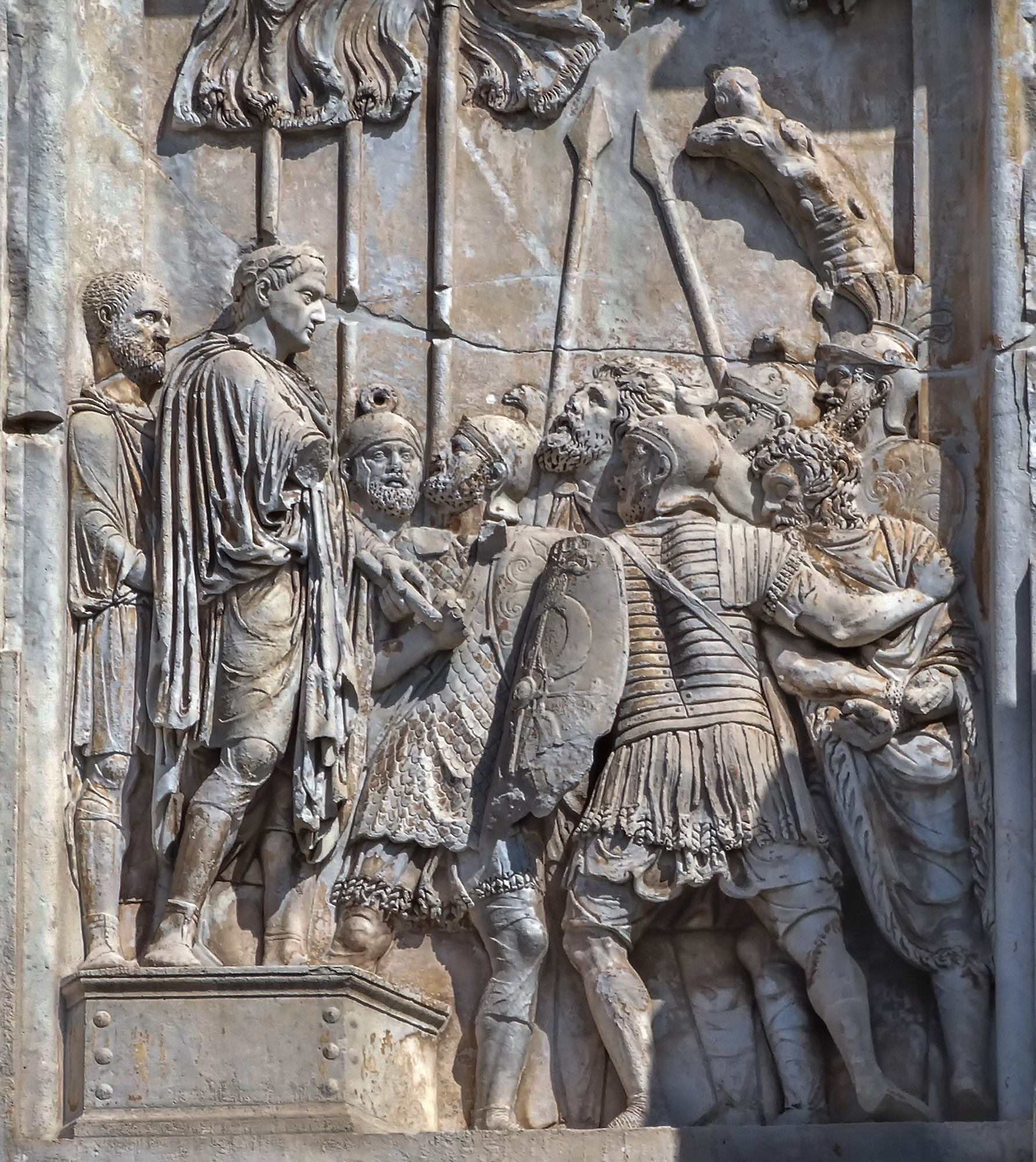34052 Attikarelief auf der Südseite des Konstantinsbogens: Kriegsgefangene vor Marc Aurel