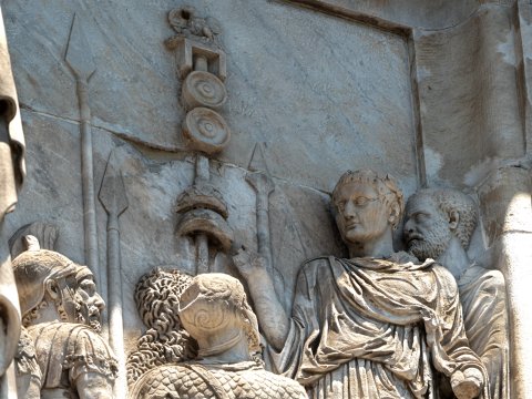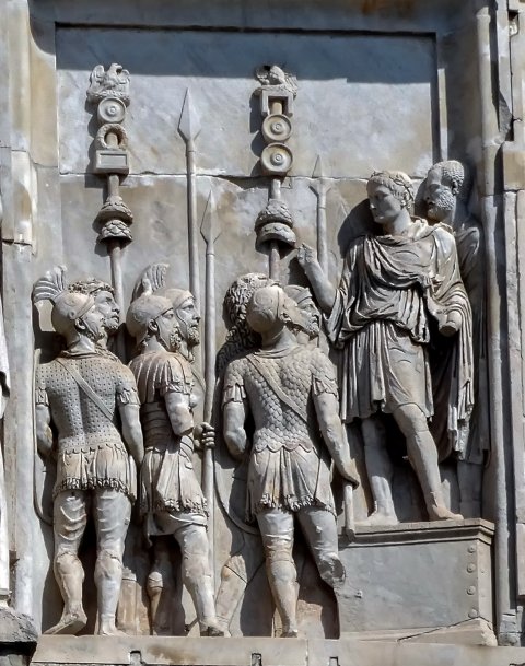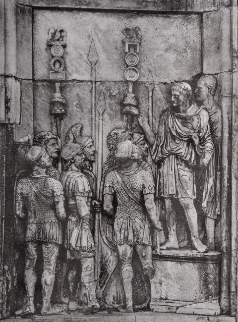 Relief von einem Ehrenmonument (Triumphbogen ?) für Marc Aurel, errichtet von Commodus. Adlocutio des Marc Aurel. Der Kaiser steht auf einem Podest, hinter ihm Begleiter. Vor dem Podest eine Gruppe von Soldaten mit Speeren und zwei Feldzeichen (signa).
