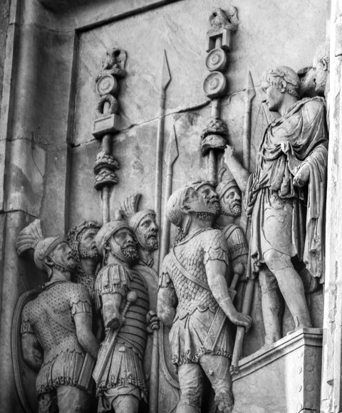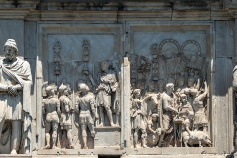 oberer Teil ergänzt, einige Reliefteile abgebr., Kopf des Kaisers im 18. Jh. durch Trajansporträt ersetzt