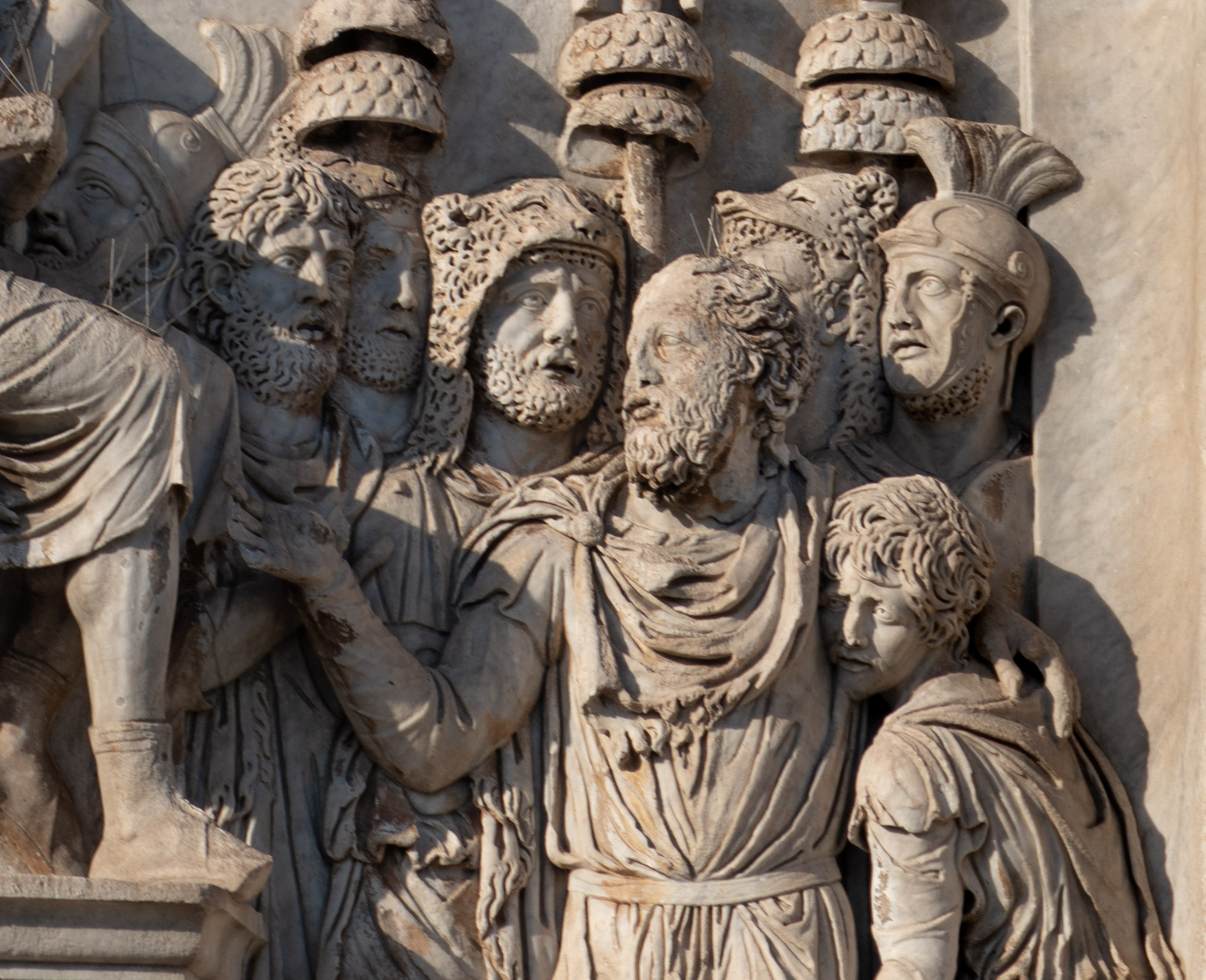 34058 Attikarelief auf der Nordseite des Konstantinsbogens: Kriegsgefangene vor Marc Aurel