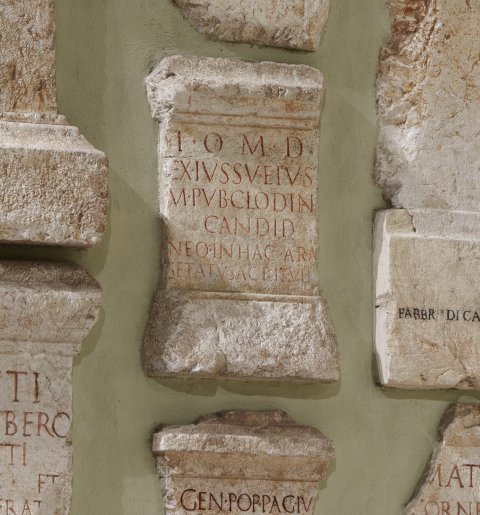 - I(ovi) O(ptimo) M(aximo) D(olicheno) / ex iussu eius / M(arcus) Pub(licius?) Clodian(us) / candidat(us) / neq in hac ara / setatu(m) sac(rificare) rit(e) v[e]li[t]
