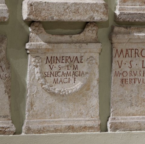 - Minervae / v(otum) s(olvit) l(ibens) m(erito) / Seneca Magia / Magi f(ilia)