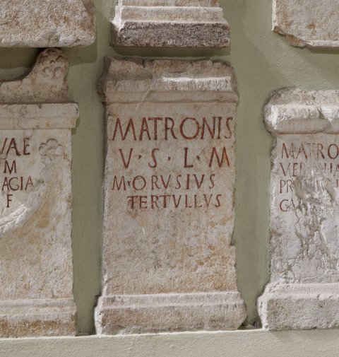 - Matronis / v(otum) s(olvit) l(ibens) m(erito) / M(arcus) Orusius / Tertullus