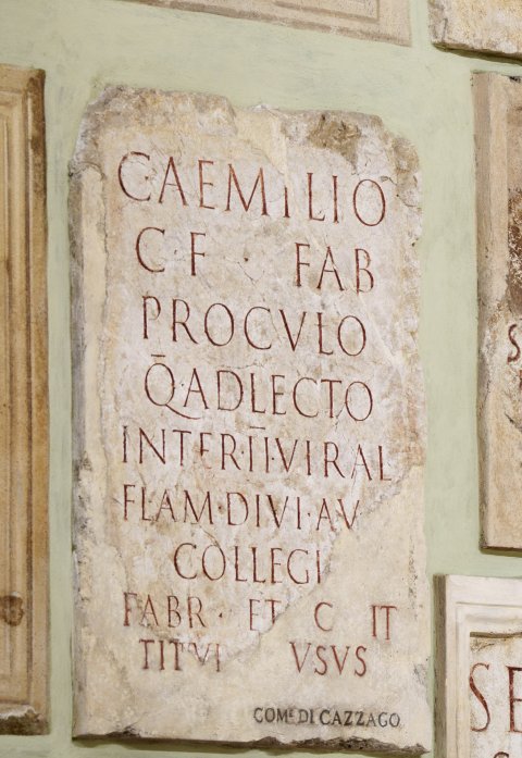 - C(aio) Aemilio / C(ai) f(ilio) Fab(ia) / Proculo / q(uaestori) adlecto / inter IIviral(es) / flam(ini) divi Aug(usti) / collegi[a] / fabr(orum) et cent(onariorum) / [ti]tul(o) usus