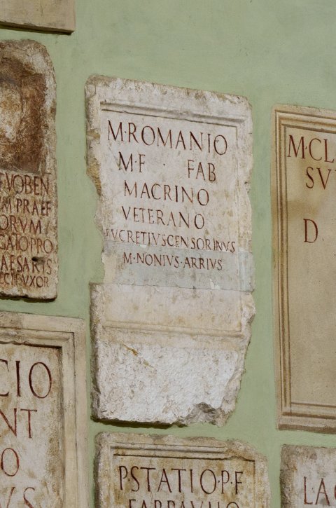 - M(arco) Romanio / M(arci) f(ilio) Fab(ia) / Macrino / veterano / Lucretius Censorinus / [---