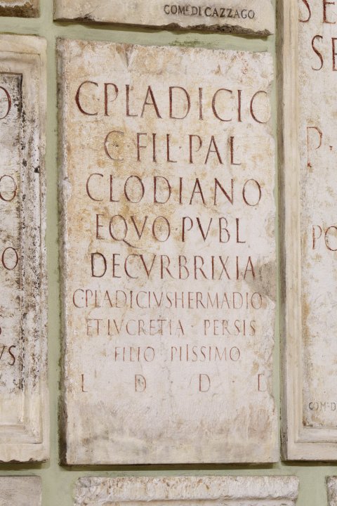 - C(aio) Pladicio / C(ai) fil(io) Pal(atina) / Clodiano / equo publ(ico) / decur(ioni) Brixiae / C(aius) Pladicius Hermadion / et Lucretia Persis / filio piissimo / l(ocus) d(atus) d(ecreto) d(ecurionum)